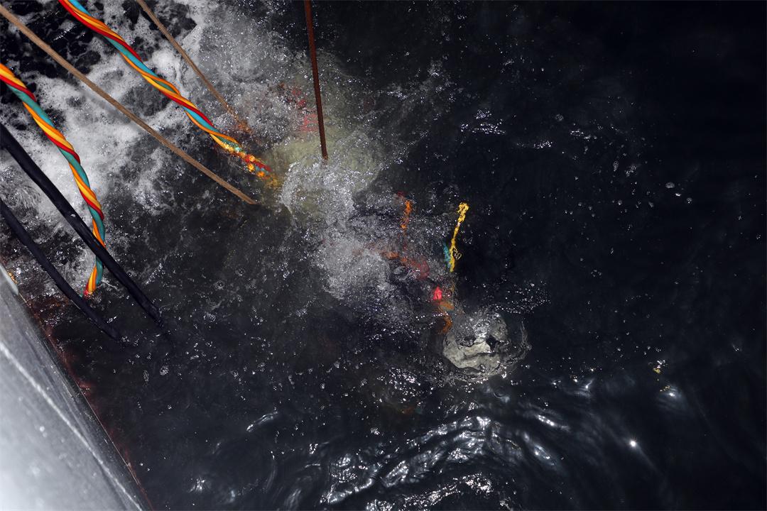 水下環(huán)境錯綜復(fù)雜,張虎成完成任務(wù)準(zhǔn)備出水時,突然發(fā)現(xiàn)信號繩被艙內(nèi)雜物死死卡住。為了爭取時間,他當(dāng)機(jī)立斷直接將信號繩割斷,快速浮出水面。