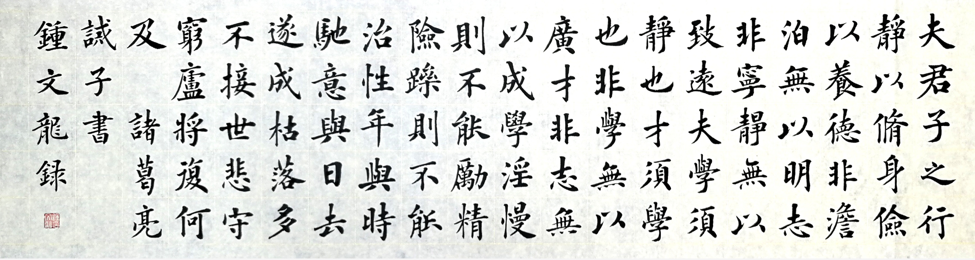 如何將家庭教育與書法有機(jī)結(jié)合?鐘文龍?zhí)剿鞒隽艘粭l用楷書書寫歷朝傳世家訓(xùn)名篇的道路,他在不斷書寫《顏氏家訓(xùn)》《家范》《誡子書》《朱子家訓(xùn)》等歷朝傳世家訓(xùn)名篇的過程中,逐漸感悟到通過楷書來書寫家訓(xùn),并在家中進(jìn)行懸掛,可以起到潤物無聲潛移默化的激勵匡正等教育作用。