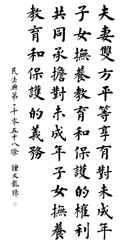 2020年7月11日,司法部普法與依法治理局和法制日報社共同主辦了“書·法”系列活動。鐘文龍先生應(yīng)邀書寫民法典第一千零五十八條: “夫妻雙方平等享有對未成年子女撫養(yǎng)、教育和保護(hù)的權(quán)利,共同承擔(dān)對未成年子女撫養(yǎng)、教育和保護(hù)的義務(wù)?!币蚱渥髌分苷胖露H受好評。