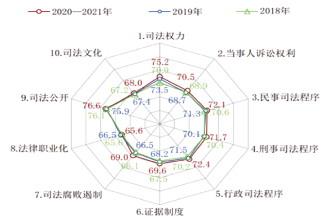 2.2020-2021年值得注意的數(shù)據(jù):一是上海市以73.3分排在中國(guó)司法文明指數(shù)得分第一名,這是其在七年評(píng)估中第五次排名第一,比2019年第一名浙江的72.5分高出0.8分;內(nèi)蒙古自治區(qū)以69.2分在各省/自治區(qū)/直轄市中排名墊底,但比2019年最低分湖南67.1分提高了2.1分;二是31個(gè)省/自治區(qū)/直轄市最高分與最低分的分差為4.1分,相較于2019年最大分差5.4分,縮小了1.3分,這說明全國(guó)各地司法文明的差距進(jìn)一步縮??;三是31個(gè)省/自治區(qū)/直轄市的得分均未達(dá)到“良好”水平,說明各地司法文明建設(shè)還有很大的努力空間。