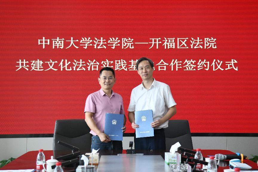 中南大學(xué)法學(xué)院院長許中緣,長沙市開福區(qū)人民法院黨組書記、院長吳欣鄭重簽署實(shí)踐基地戰(zhàn)略合作協(xié)議。