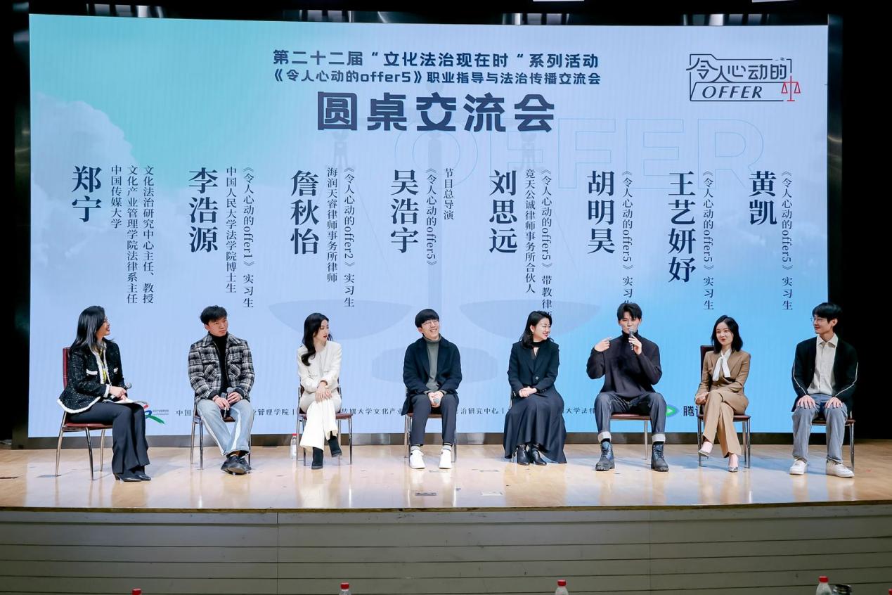 圓桌交流環(huán)節(jié)由中國(guó)傳媒大學(xué)文化產(chǎn)業(yè)管理學(xué)院法律系主任、文化法治研究中心主任鄭寧主持。與會(huì)嘉賓圍繞參加節(jié)目的收獲、個(gè)人選擇和成長(zhǎng)的心路歷程、如何提升職場(chǎng)競(jìng)爭(zhēng)力、對(duì)在校生的求職建議以及如何打造職場(chǎng)觀察類綜藝節(jié)目等話題進(jìn)行了交流分享,就《令人心動(dòng)的offer5》的社會(huì)價(jià)值、求職經(jīng)驗(yàn)、如何提升自身能力等話題為同學(xué)們答疑解惑,并提出務(wù)實(shí)建議。