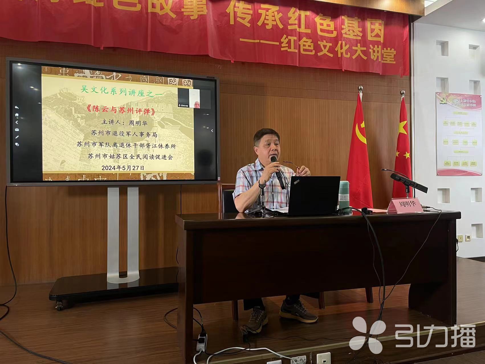 5月27日,首期“紅色文化大講堂”在蘇州市軍隊離休退休干部胥江休養(yǎng)所開講,邀請著名蘇州評話藝術家周明華主講《陳云與蘇州評彈》,以生動活潑的形式講好紅色故事,傳承紅色基因。