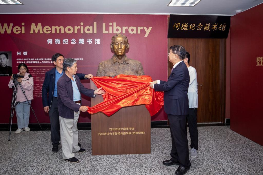 西北政法大學(xué)黨委副書記、校長范九利,人民日報出版社總編輯丁丁,新華社寧夏分社、吉林分社原社長申尊敬,中國新聞史學(xué)會新聞傳播教育史研究會會長張昆,以及何微親屬代表張振林等出席了揭幕儀式并致辭。西北政法大學(xué)黨委副書記、紀委書記、監(jiān)察專員劉志彬主持揭幕儀式。