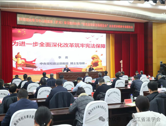 11月29日,黑龍江省鶴崗市委理論學(xué)習(xí)中心組集體(擴(kuò)大)學(xué)習(xí)暨2024年“百名法學(xué)家百場報(bào)告會”法治宣講專場報(bào)告會在鶴崗舉行,邀請中央黨校政法部教授、博士生導(dǎo)師李勇作專題講座。鶴崗市委書記王興柱及市委理論學(xué)習(xí)中心組成員,市級班子秘書長、市直各單位主要領(lǐng)導(dǎo)、各縣區(qū)領(lǐng)導(dǎo)、政法各單位科以上干部及法學(xué)會全體會員參加。兩縣六區(qū)、市公安局、市教育培訓(xùn)基地設(shè)立分會場,共1100余人參會。市委副書記、市委政法委書記馬春波主持。