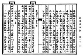 “事例”原指先前存在的成例。在中國古代,事例對后發(fā)類案之處置,多具指導意義。西晉時,楊駿以謀反之罪見誅,其弟楊珧雖陳情自告仍受牽連?!爱敃r皆謂宜為申理,合依鐘繇事例”,時人援引鐘繇免于鐘會之誅事,欲援救楊珧。逮至明代,“事例”已表現出與會典的密切聯系?!度f歷會典》載,“其近年六部等衙門見行事例,各令選委司屬官,遵照體例,分類編集”。洎乎清代,“會典事例”作為一種法律形式繼續(xù)發(fā)展?!犊滴鯐洹仿氏壤宥ā笆吕钡念愋?。乾隆時,認為“夫例可通,典不可變”,典與例當分離。遂在制定《大清會典》之余,另編《大清會典則例》180卷。嘉慶朝在編纂《大清會典》之外,又有《大清會典事例》920卷、《欽定大清會典圖》132卷。至此,“會典事例”以一種法律形式獨立于“會典”存在。