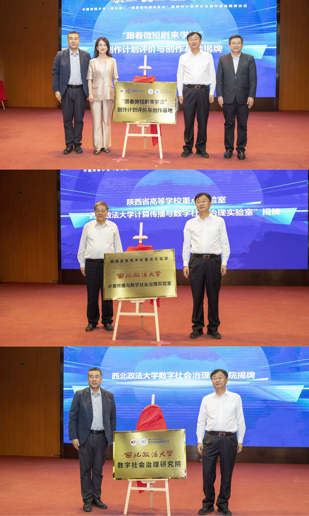 開幕式上,范九利與闞平共同為“跟著微短劇來學法”創(chuàng)作計劃評價與創(chuàng)作基地揭牌。隨后,孫憲忠與范九利為西北政法大學“計算傳播與數(shù)字社會治理陜西省高等學校重點實驗室”揭牌,范九利與西北政法大學新聞傳播學院(藝術學院)院長孫江為西北政法大學數(shù)字社會治理研究院揭牌。該實驗室及研究院將持續(xù)整合學校內外法學、新聞傳播學與計算機科學資源,探索AI劇本生成、虛擬庭審場景等技術應用,為普法宣傳提供技術支撐。