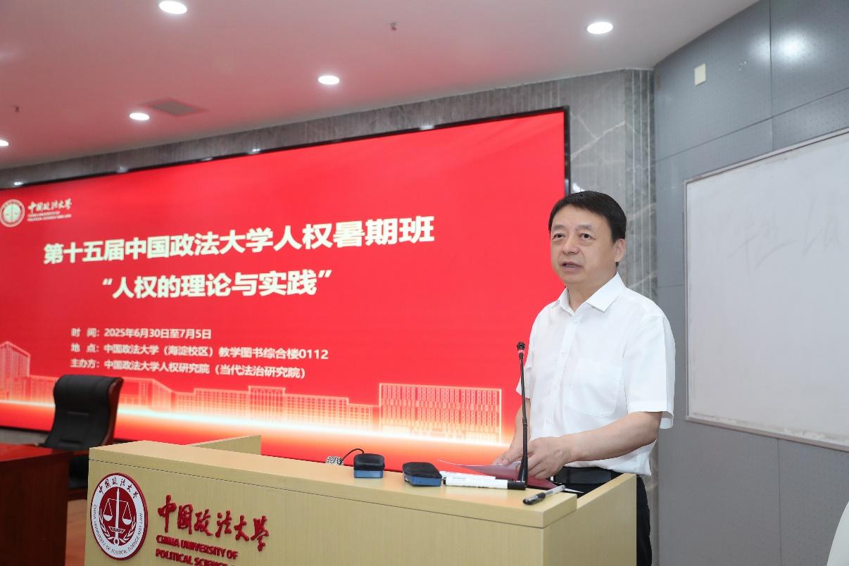 中國政法大學(xué)校長馬懷德出席開班儀式并致辭。馬懷德提出,中國政法大學(xué)始終致力于推動中國特色法學(xué)學(xué)科體系、學(xué)術(shù)體系、話語體系建設(shè),構(gòu)建中國法學(xué)自主知識體系。作為“國家人權(quán)教育與培訓(xùn)基地”和“國家高端智庫建設(shè)培育單位”,人權(quán)研究院(當代法治研究院)不斷提升政治站位,深入貫徹落實國家人權(quán)行動計劃,堅定履行人權(quán)教育培訓(xùn)、理論研究、對外交流三大使命。他強調(diào),人權(quán)是全人類共同的價值追求,人權(quán)教育不僅是知識的傳授,更是價值的塑造與人格的涵養(yǎng)。人權(quán)暑期班作為一項高水平、跨領(lǐng)域、國際化的人權(quán)教育實踐,不僅是人權(quán)知識的傳播課堂,更是理念交匯的對話平臺,青年學(xué)子應(yīng)以跨學(xué)科視角,多維度、多視角、多層次了解人權(quán)研究的重大議題,在多邊、多元的交流中不斷拓展全球視野與認知邊界,努力成為具有全球視野和中國立場的法治人才。他同時希望各位學(xué)員能夠借此機會深入開展學(xué)術(shù)交流,共同推動中國人權(quán)學(xué)科建設(shè)、學(xué)術(shù)研究與國際傳播。