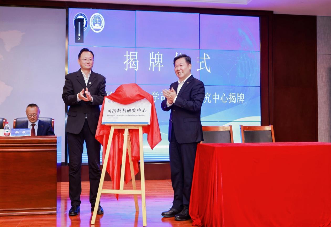 對外經(jīng)濟(jì)貿(mào)易大學(xué)黨委書記黃寶印,最高人民檢察院咨詢委員會副主任徐顯明共同為司法裁判研究中心揭牌。主辦方供圖