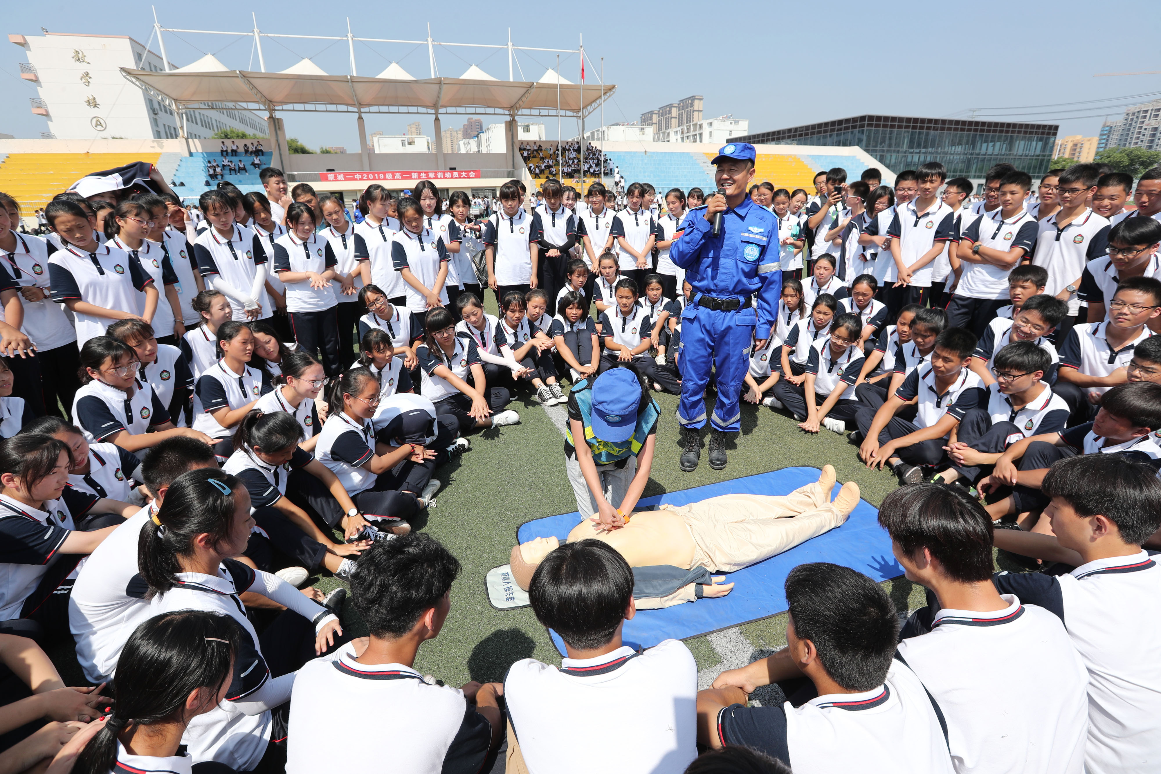 8月29日,安徽省蒙城縣第一中學操場,志愿者向高一新生演示介紹心腹復(fù)蘇急救要領(lǐng)。
