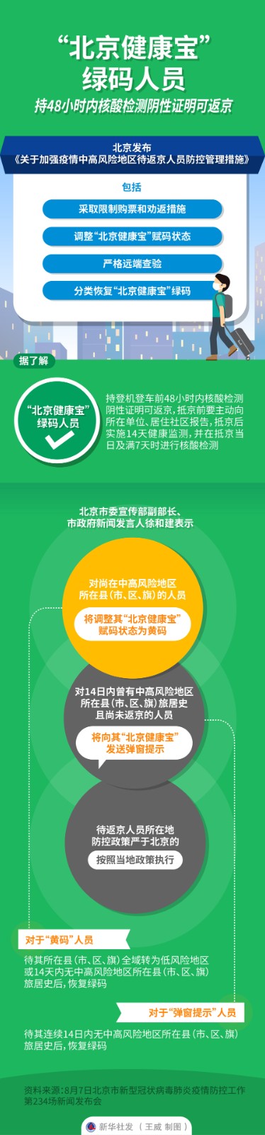 記者8月7日從北京市新型冠狀病毒肺炎疫情防控工作第234場新聞發(fā)布會獲悉,北京發(fā)布《關于加強疫情中高風險地區(qū)待返京人員防控管理措施》,包括采取限制購票和勸返措施、調整“北京健康寶”賦碼狀態(tài)、嚴格遠端查驗、分類恢復“北京健康寶”綠碼。