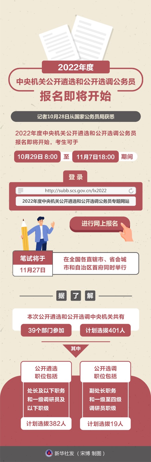 記者10月28日從國家公務(wù)員局獲悉,2022年度中央機(jī)關(guān)公開遴選和公開選調(diào)公務(wù)員報(bào)名即將開始,考生可于10月29日8:00至11月7日18:00期間,登錄“2022年度中央機(jī)關(guān)公開遴選和公開選調(diào)公務(wù)員專題網(wǎng)站”(http://subb.scs.gov.cn/lx2022)進(jìn)行網(wǎng)上報(bào)名,筆試將于11月27日在全國各直轄市、省會(huì)城市和自治區(qū)首府同時(shí)舉行。