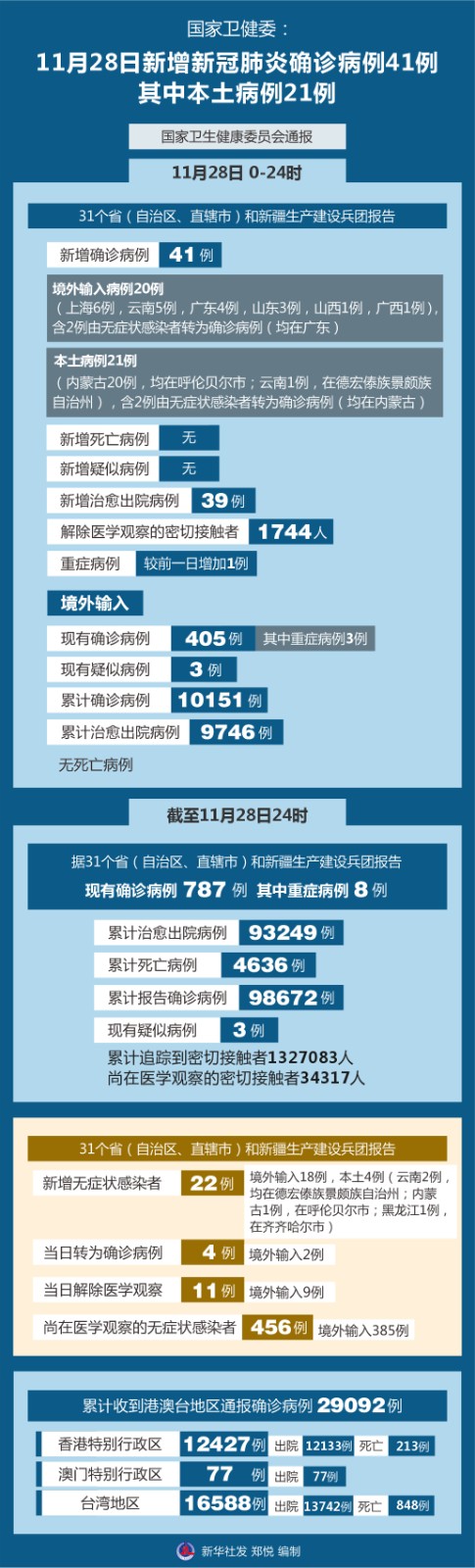 圖表:國家衛(wèi)健委:11月28日新增新冠肺炎確診病例41例 其中本土病例21例