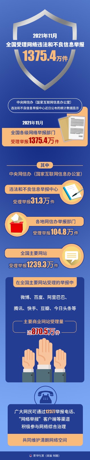 中央網(wǎng)信辦(國家互聯(lián)網(wǎng)信息辦公室)違法和不良信息舉報(bào)中心近日公布的統(tǒng)計(jì)數(shù)據(jù)顯示,今年11月,全國各級(jí)網(wǎng)絡(luò)舉報(bào)部門受理舉報(bào)1375.4萬件。