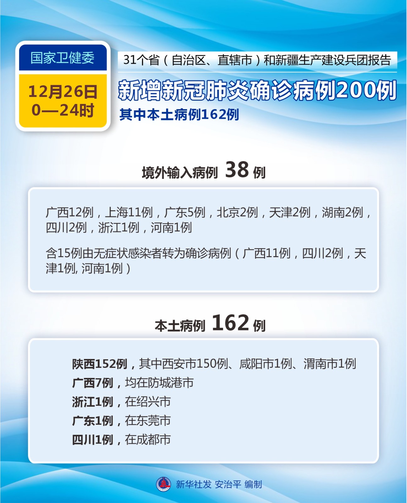 國家衛(wèi)生健康委員會12月27日通報,12月26日0至24時,31個?。ㄗ灾螀^(qū)、直轄市)和新疆生產(chǎn)建設(shè)兵團(tuán)報告新增新冠肺炎確診病例200例。其中境外輸入病例38例(廣西12例,上海11例,廣東5例,北京2例,天津2例,湖南2例,四川2例,浙江1例,河南1例),含15例由無癥狀感染者轉(zhuǎn)為確診病例(廣西11例,四川2例,天津1例,河南1例);本土病例162例(陜西152例,其中西安市150例、咸陽市1例、渭南市1例;廣西7例,均在防城港市;浙江1例,在紹興市;廣東1例,在東莞市;四川1例,在成都市),含5例由無癥狀感染者轉(zhuǎn)為確診病例(均在廣西)。無新增死亡病例。新增疑似病例4例,均為境外輸入病例(上海2例,浙江2例)。