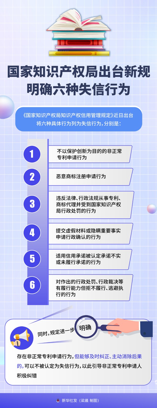 《國家知識產(chǎn)權(quán)局知識產(chǎn)權(quán)信用管理規(guī)定》近日出臺,將六種具體行為列為失信行為,分別是:不以保護(hù)創(chuàng)新為目的的非正常專利申請行為,惡意商標(biāo)注冊申請行為,違反法律、行政法規(guī)從事專利、商標(biāo)代理并受到國家知識產(chǎn)權(quán)局行政處罰的行為,提交虛假材料或隱瞞重要事實(shí)申請行政確認(rèn)的行為,適用信用承諾被認(rèn)定承諾不實(shí)或未履行承諾的行為,對作出的行政處罰、行政裁決等有履行能力但拒不履行、逃避執(zhí)行的行為。