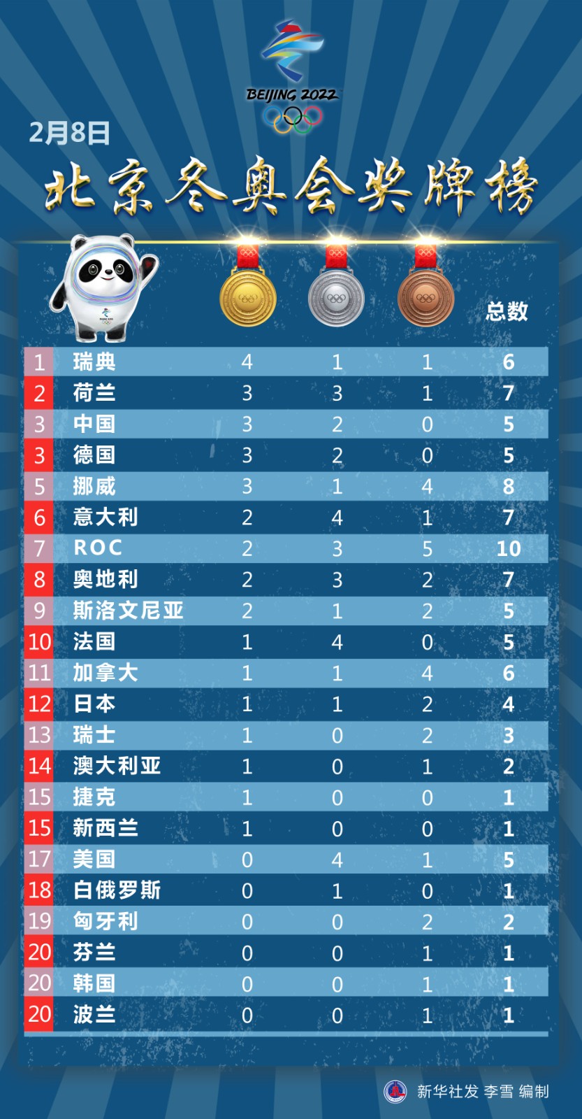 圖表:2月8日北京冬奧會獎牌榜