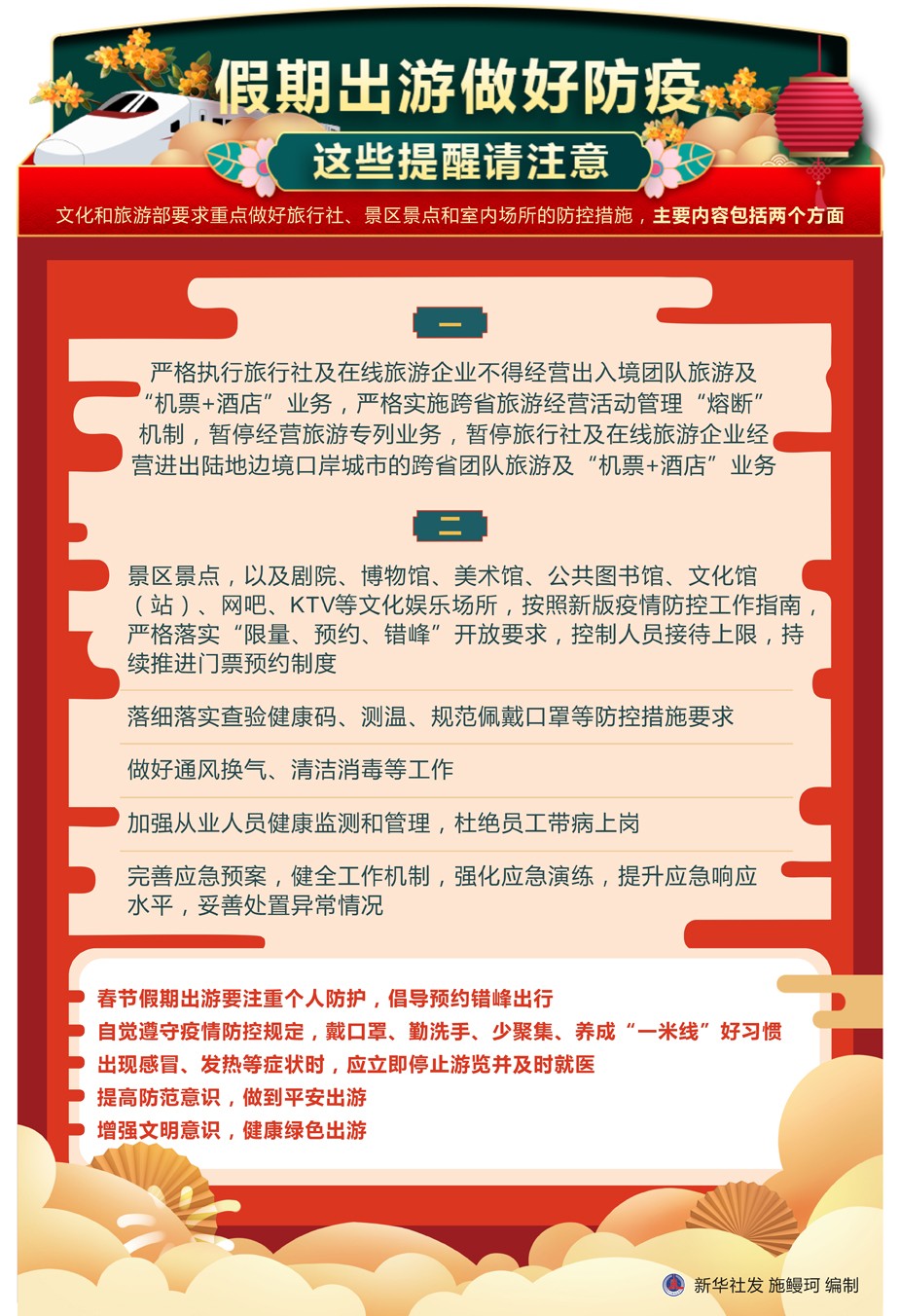 春節(jié)期間是人們出游的高峰時段。在當(dāng)前疫情形勢下,春節(jié)期間怎樣安全出游?各地又是如何按照精準(zhǔn)防控的要求保障廣大游客度過一個歡樂、祥和、平安的春節(jié)假期?