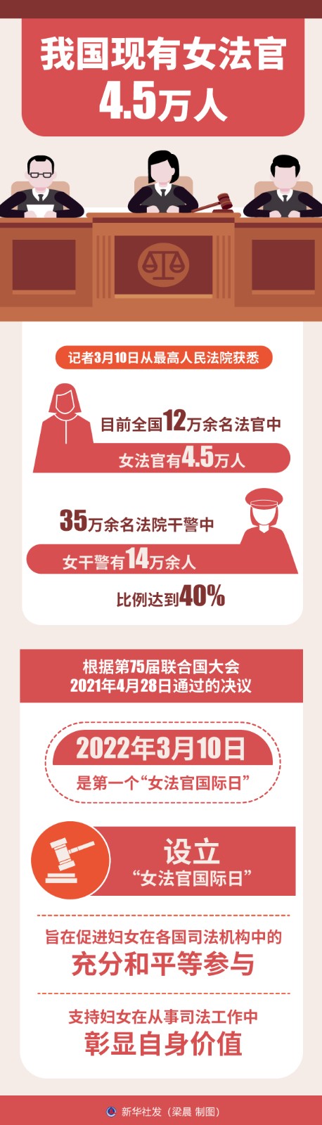 記者3月10日從最高人民法院獲悉,目前全國12萬余名法官中,女法官有4.5萬人。35萬余名法院干警中,女干警有14萬余人,比例達(dá)到40%。