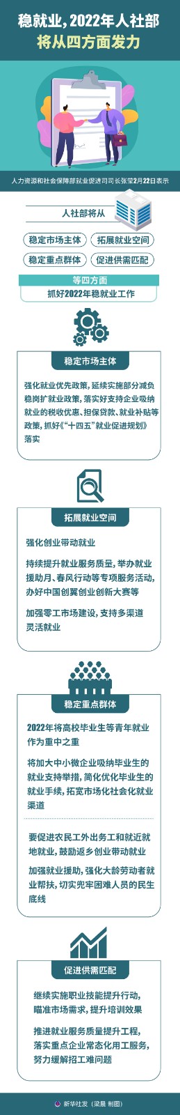 人力資源和社會保障部就業(yè)促進(jìn)司司長張瑩2月22日表示,人社部將從穩(wěn)定市場主體、拓展就業(yè)空間、穩(wěn)定重點(diǎn)群體、促進(jìn)供需匹配等四方面抓好2022年穩(wěn)就業(yè)工作。