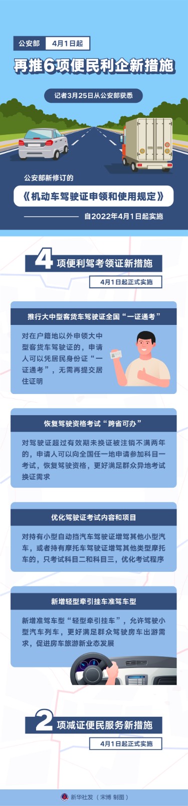 新華社記者3月25日從公安部獲悉,公安部新修訂的《機(jī)動(dòng)車駕駛證申領(lǐng)和使用規(guī)定》自2022年4月1日起實(shí)施。新修訂的部門規(guī)章對(duì)公安部近年來已推出的交管改革措施予以固化,推進(jìn)改革成果制度化、法治化,并回應(yīng)群眾新要求新期待,再推出6項(xiàng)便民利企新措施。