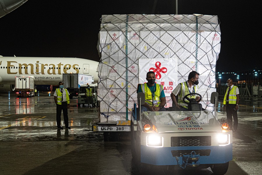 中國首批緊急人道主義藥品援助3日夜間運抵斯里蘭卡科倫坡班達拉奈克國際機場。