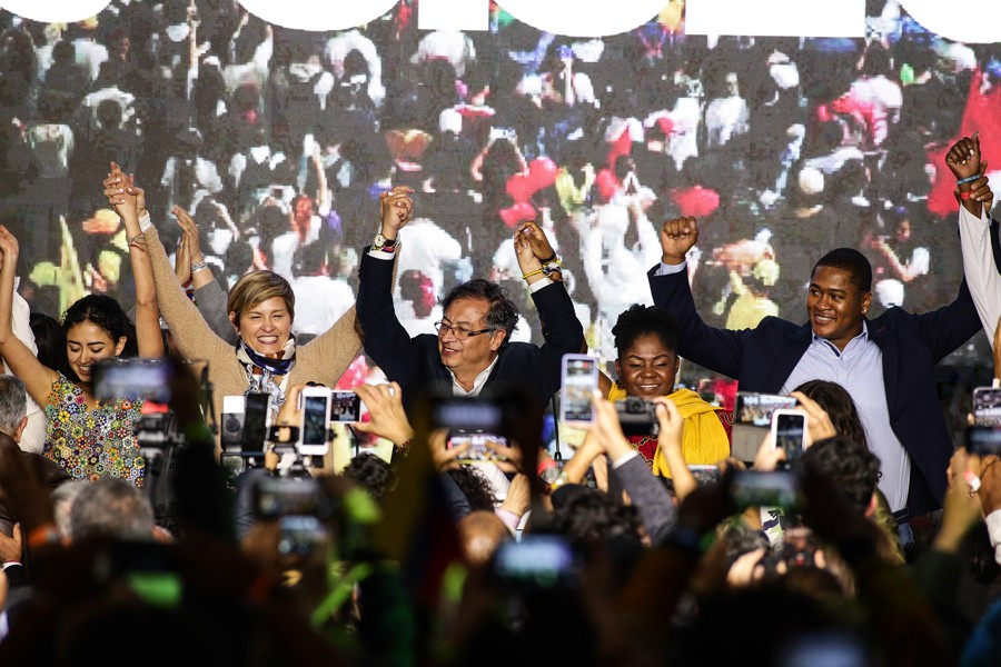 5月29日,在哥倫比亞波哥大,左翼競選聯(lián)盟“哥倫比亞歷史公約聯(lián)盟”候選人古斯塔沃·佩特羅(中)慶祝在總統(tǒng)選舉首輪投票中得票領(lǐng)先。