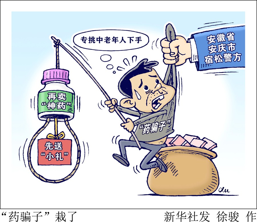 評書機(jī)、老人鞋等“小禮”請先笑納,“包治百病”的“神藥”快來試試?小心“騙你沒商量”!記者日前從安徽省安慶市宿松縣公安局了解到,當(dāng)?shù)鼐酱虻粢粋€(gè)向中老年群體虛假宣傳兜售藥品進(jìn)行詐騙的犯罪團(tuán)伙,全國多地?cái)?shù)千人上當(dāng),涉案金額近千萬元。