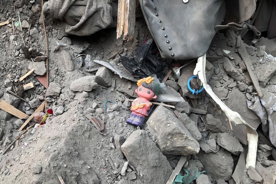 這是6月17日在埃及首都開羅樓房倒塌現(xiàn)場(chǎng)拍攝的廢墟中的玩偶。