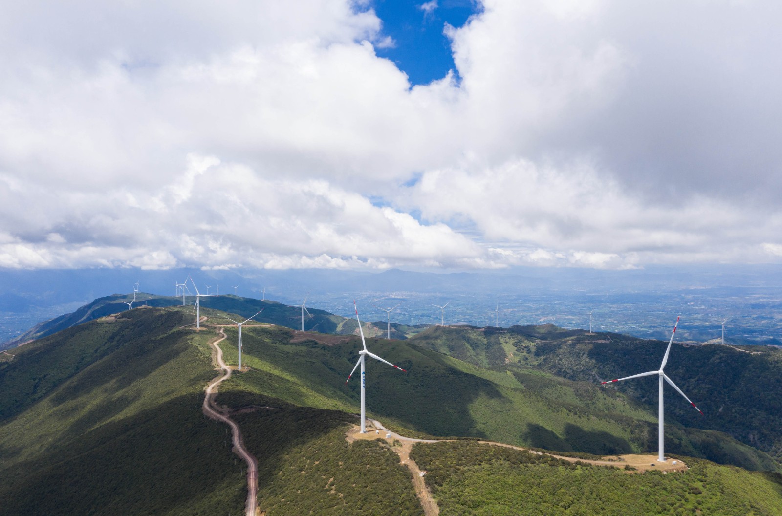 這是位于四川鹽源縣平川鎮(zhèn)的四川鹽源華電新能源有限公司的小高山風電場一角(6月20日攝,無人機照片)。