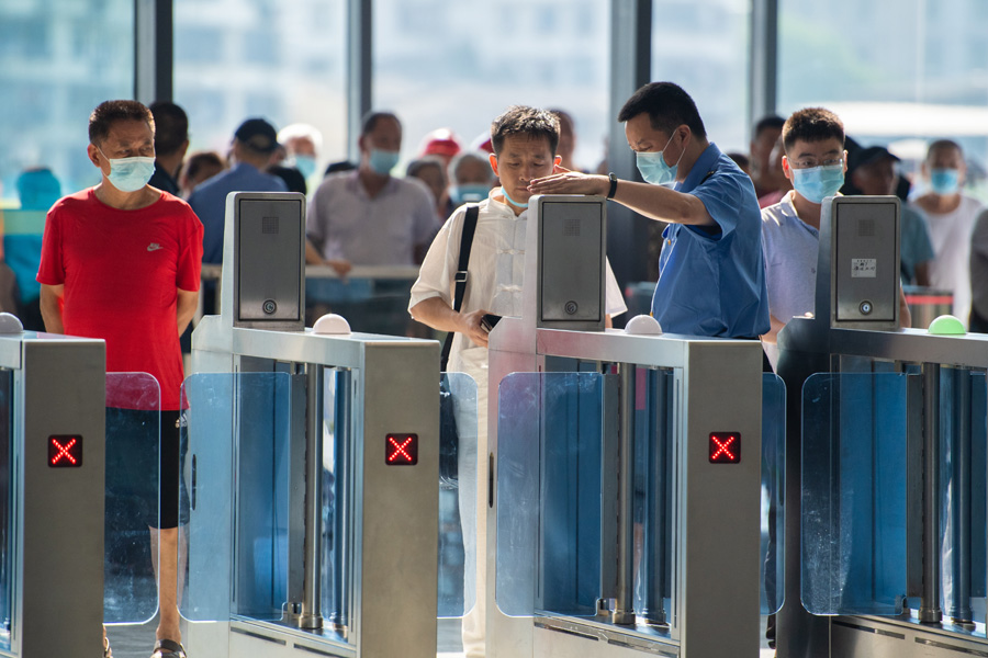 7月1日,在株洲火車站安檢區(qū),旅客進行人臉識別通過安檢。