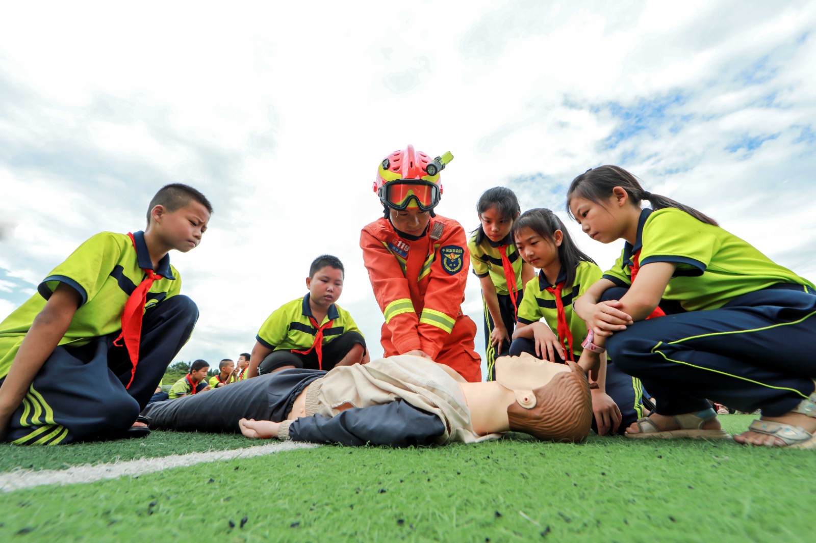 6月30日,在貴州省黔東南苗族侗族自治州岑鞏縣第三小學(xué),消防員在傳授心肺復(fù)蘇技能。