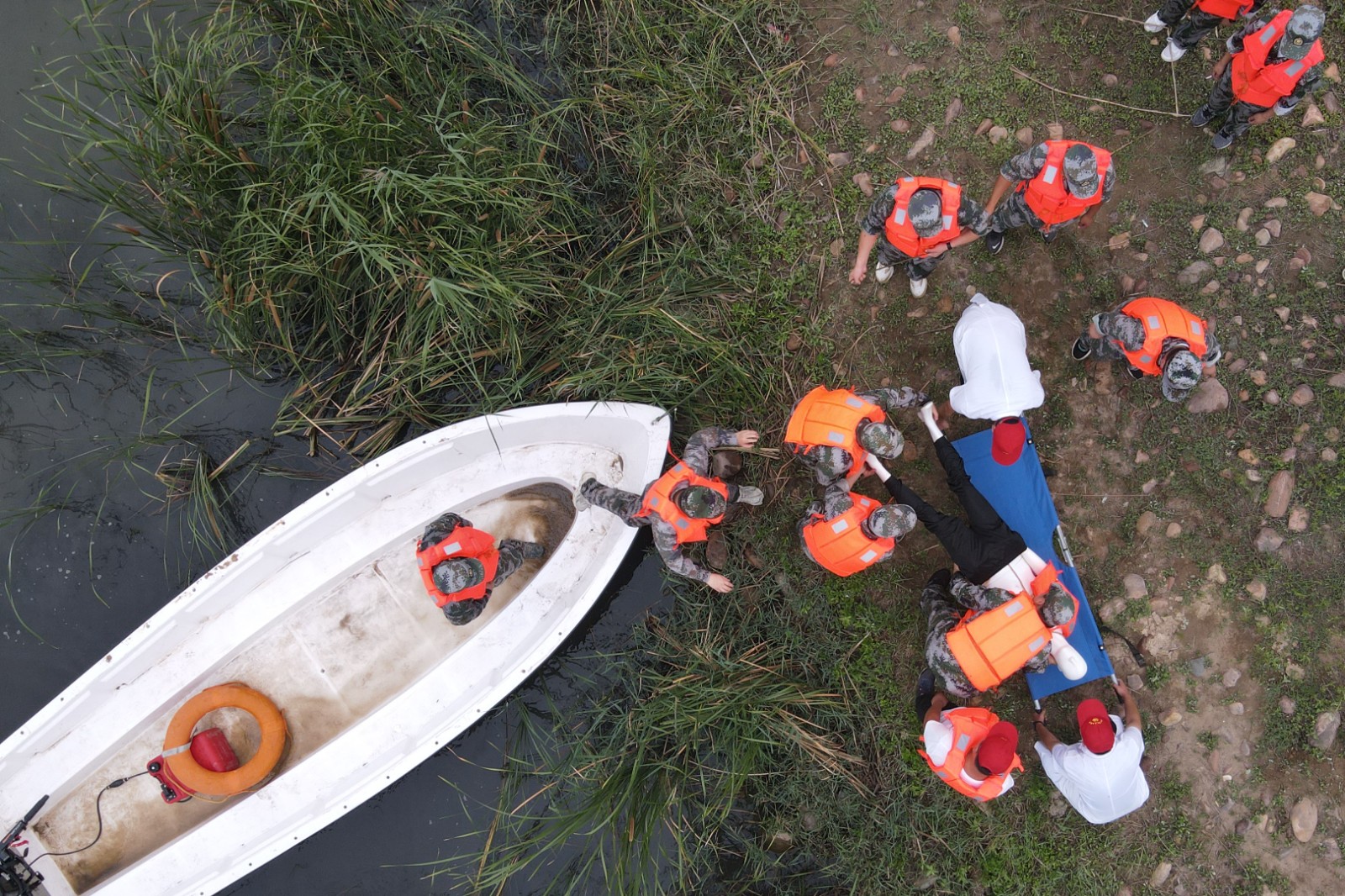 7月5日,在河北省沙河市十里亭鎮(zhèn)下解村舉行的防汛演練中,參演人員在演練營救“落水群眾”(無人機(jī)照片)。