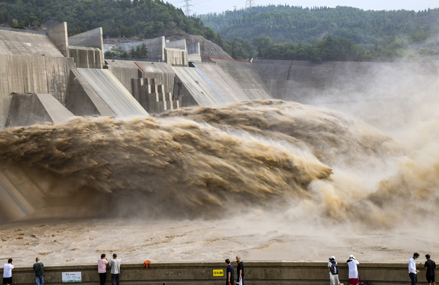 7月4日,游客觀看黃河小浪底水庫排沙出庫。