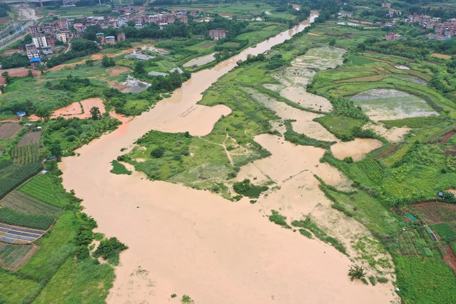 這是7月4日拍攝的廣西南寧市那平江水位上漲情況(無人機照片)。