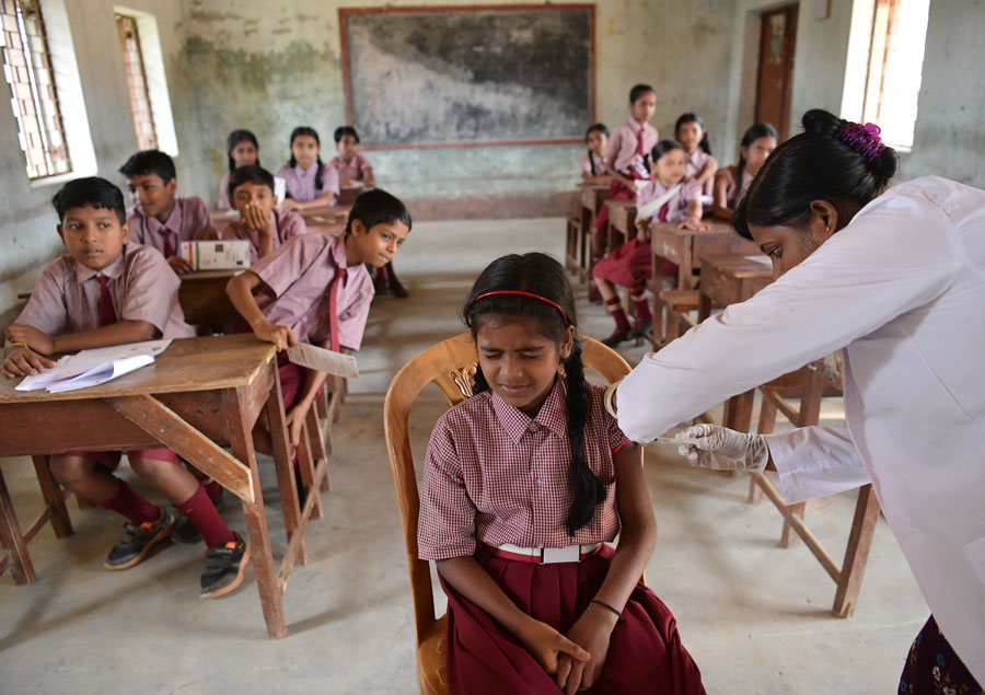 7月5日,在印度阿加爾塔拉一所學校,學生接種新冠疫苗。