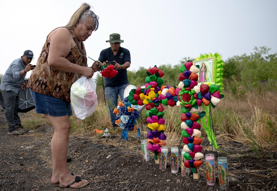 6月28日,一名女子在美國得克薩斯州圣安東尼奧市貨車慘案現(xiàn)場擺放塑料花束。