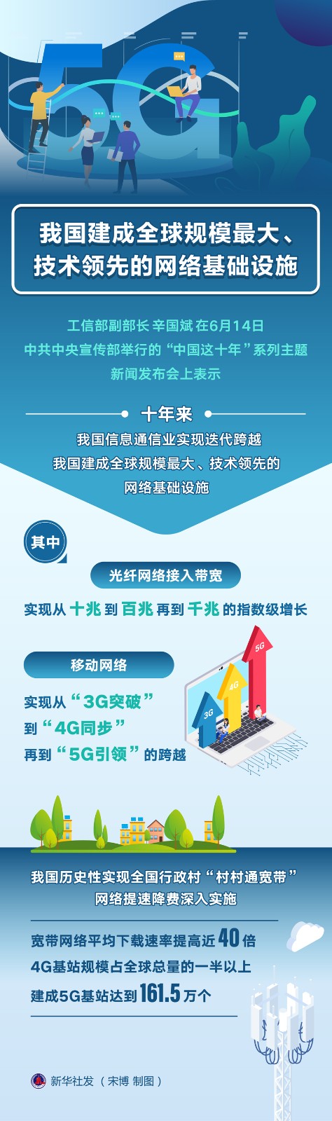 工信部副部長辛國斌在6月14日中共中央宣傳部舉行的“中國這十年”系列主題新聞發(fā)布會上表示,十年來,我國信息通信業(yè)實現(xiàn)迭代跨越,建成全球規(guī)模最大、技術(shù)領先的網(wǎng)絡基礎設施。其中,光纖網(wǎng)絡接入帶寬實現(xiàn)從十兆到百兆再到千兆的指數(shù)級增長,移動網(wǎng)絡實現(xiàn)從“3G突破”到“4G同步”再到“5G引領”的跨越。