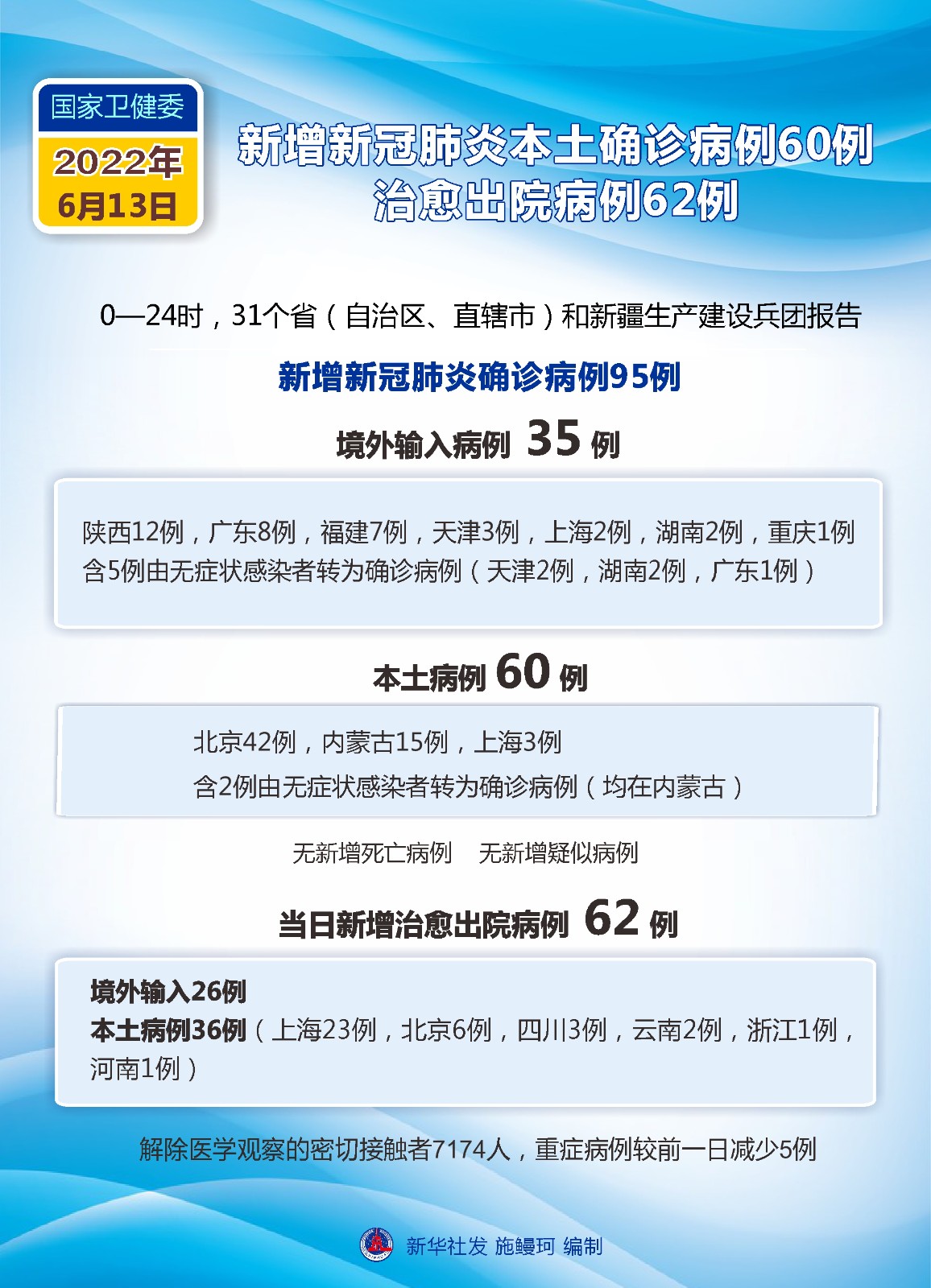 圖表:國家衛(wèi)健委:6月13日新增新冠肺炎本土確診病例60例 治愈出院病例62例