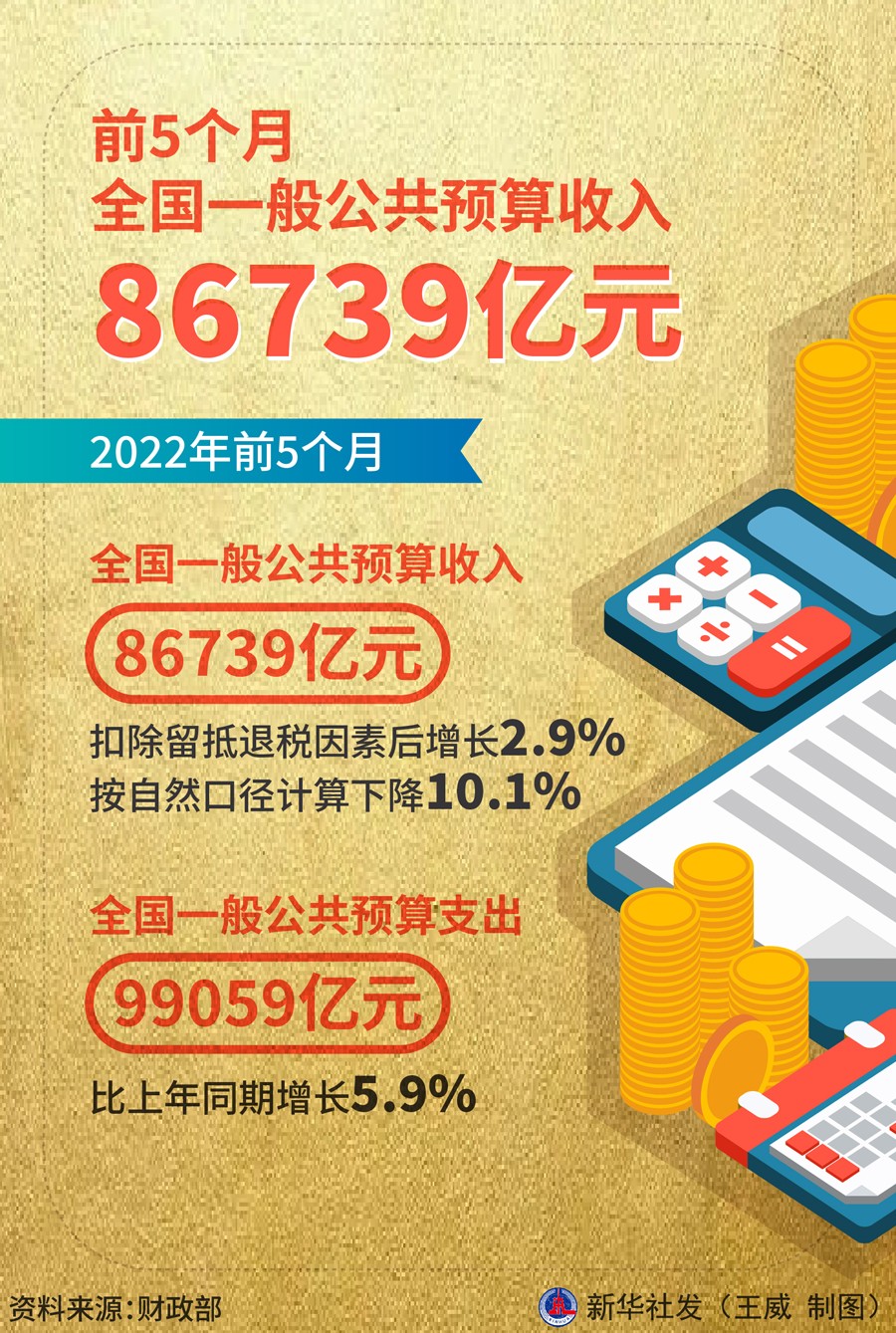 財政部6月16日發(fā)布數(shù)據(jù)顯示,今年前5個月,全國一般公共預(yù)算收入86739億元,扣除留抵退稅因素后增長2.9%,按自然口徑計算下降10.1%。