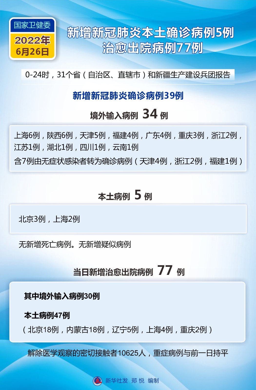 圖表:國家衛(wèi)健委:6月26日新增新冠肺炎本土確診病例5例 治愈出院病例77例