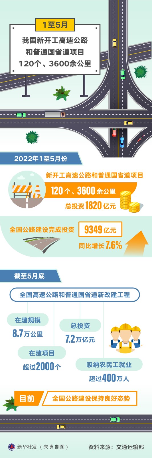 在6月27日舉行的國新辦發(fā)布會(huì)上,趙沖久表示,1至5月,全國公路建設(shè)完成投資9349億元,同比增長7.6%。截至5月底,全國高速公路和普通國省道新改建工程在建規(guī)模8.7萬公里,在建項(xiàng)目超過2000個(gè),總投資7.2萬億元,吸納農(nóng)民工就業(yè)超過400萬人?!澳壳?,全國公路建設(shè)保持良好態(tài)勢?!?/p>