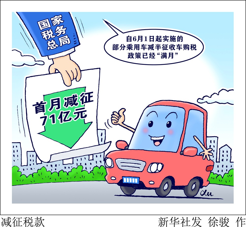 自6月1日起實(shí)施的部分乘用車減半征收車購稅政策已經(jīng)“滿月”。國家稅務(wù)總局最新數(shù)據(jù)顯示,政策實(shí)施首月,全國共減征車購稅71億元,減征車輛109.7萬輛。