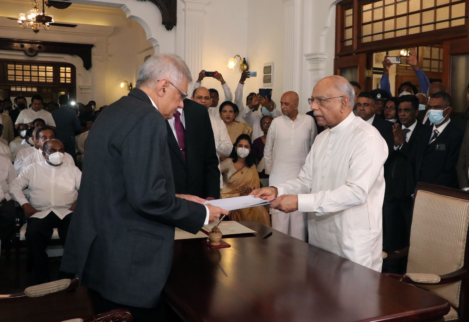 7月22日,斯里蘭卡新總理古納瓦德納(前右)在科倫坡宣誓就職。