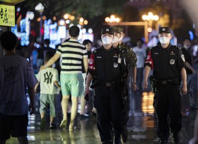 圖為7月18日晚,民警聯(lián)合武警在步行街進(jìn)行巡邏。