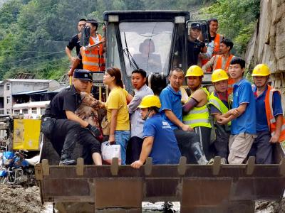 圖為綿陽市公安局特巡警支隊特警大隊民警和其他救援人員一起乘坐推土機(jī)前往災(zāi)情嚴(yán)重地點救援群眾。