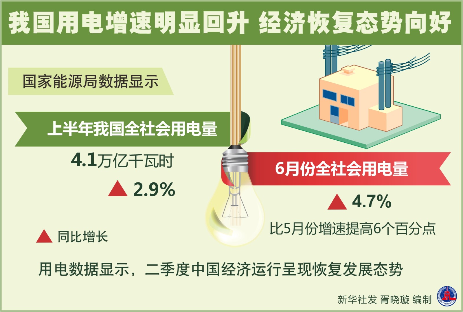 國(guó)家能源局?jǐn)?shù)據(jù)顯示,上半年我國(guó)全社會(huì)用電量4.1萬(wàn)億千瓦時(shí),同比增長(zhǎng)2.9%。6月份全社會(huì)用電量同比增長(zhǎng)4.7%,比5月份增速提高6個(gè)百分點(diǎn)。用電數(shù)據(jù)顯示,二季度中國(guó)經(jīng)濟(jì)運(yùn)行呈現(xiàn)恢復(fù)發(fā)展態(tài)勢(shì)。