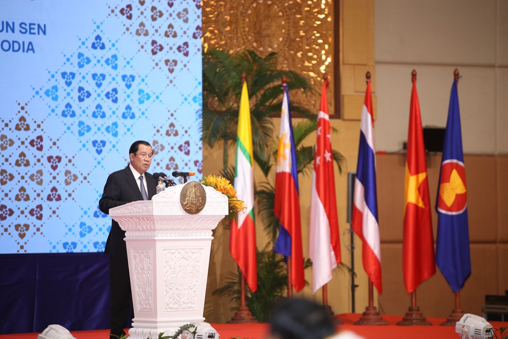 8月3日,柬埔寨首相洪森在首都金邊舉行的東盟外長會議上發(fā)言。