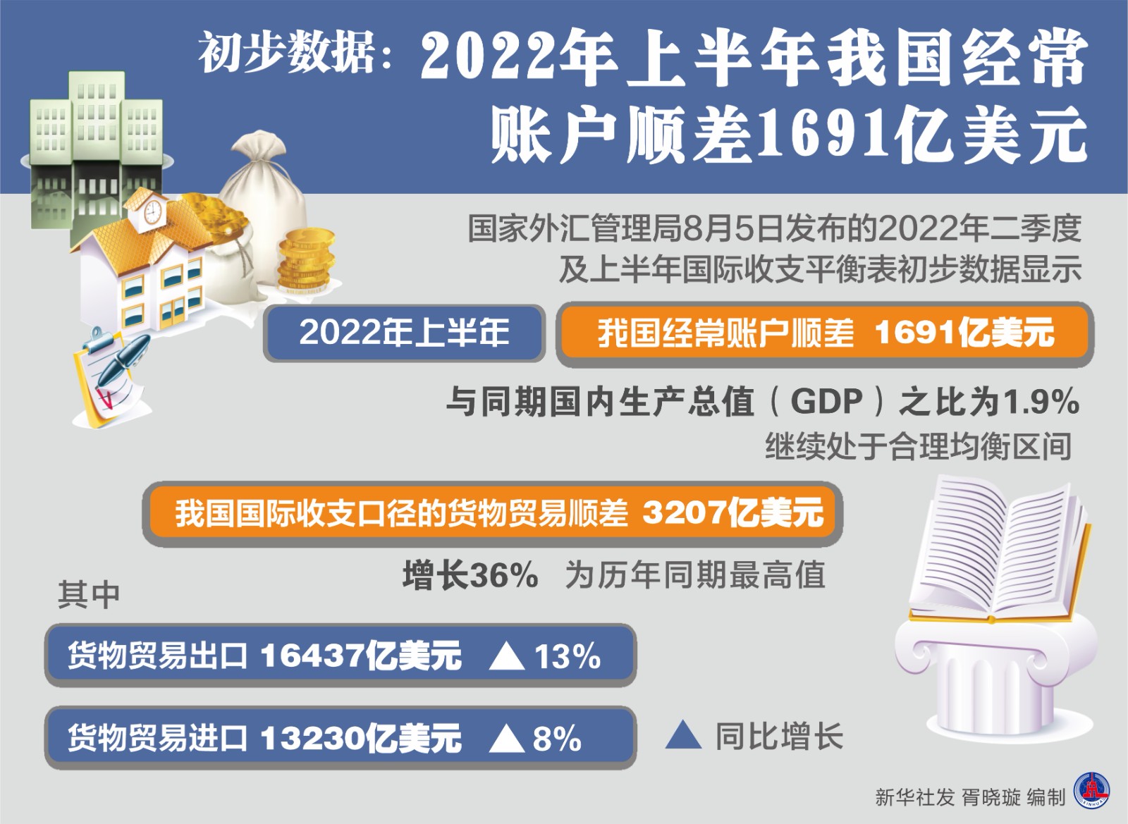 國家外匯管理局8月5日發(fā)布的2022年二季度及上半年國際收支平衡表初步數(shù)據(jù)顯示,2022年上半年,我國經(jīng)常賬戶順差1691億美元,與同期國內(nèi)生產(chǎn)總值(GDP)之比為1.9%,繼續(xù)處于合理均衡區(qū)間。