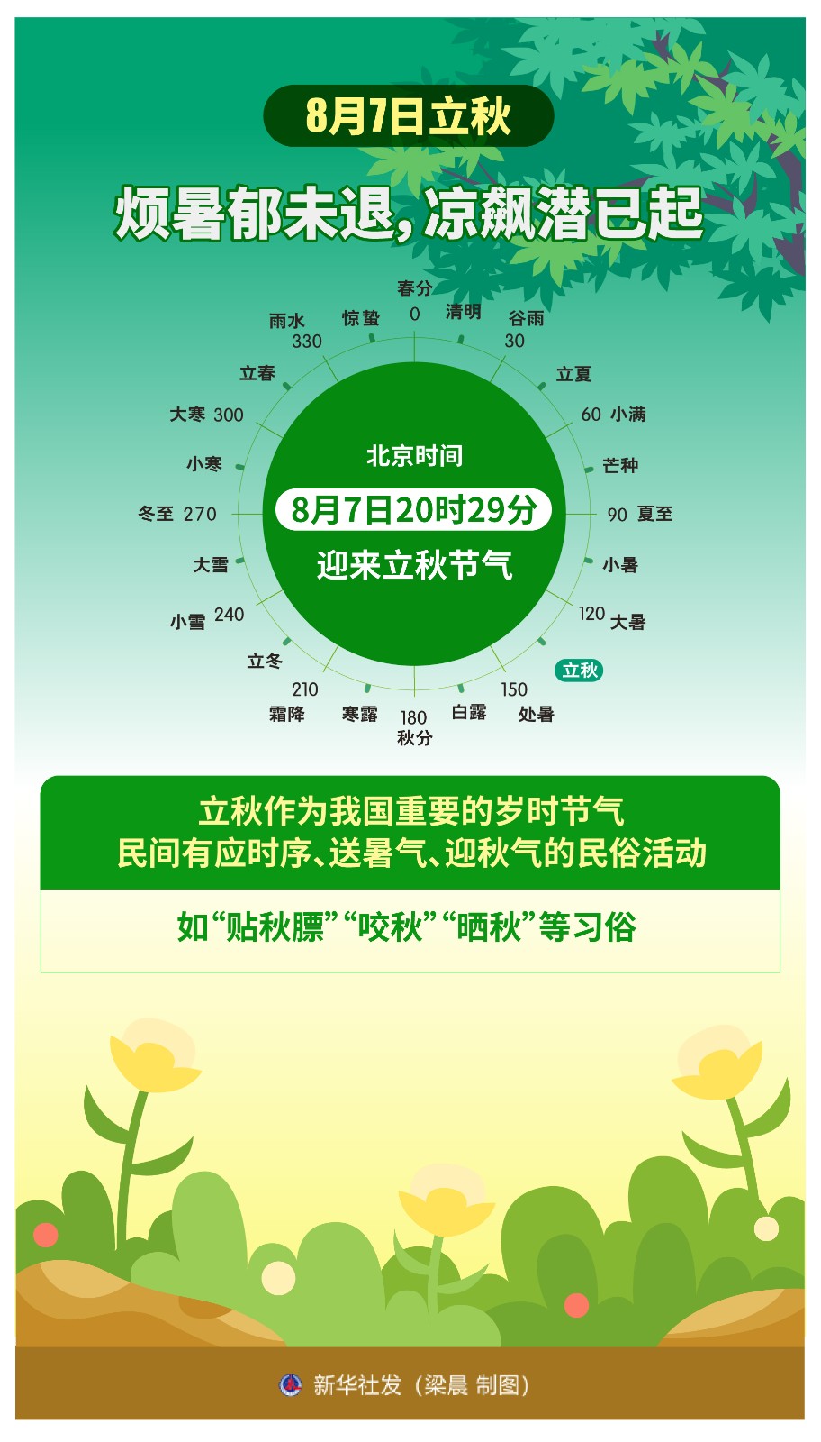 “煩暑郁未退,涼飆潛已起”,北京時間8月7日20時29分將迎來立秋節(jié)氣。此時雖已立秋,但“秋老虎”依然發(fā)威,炎熱逼人,暑氣一時難消。